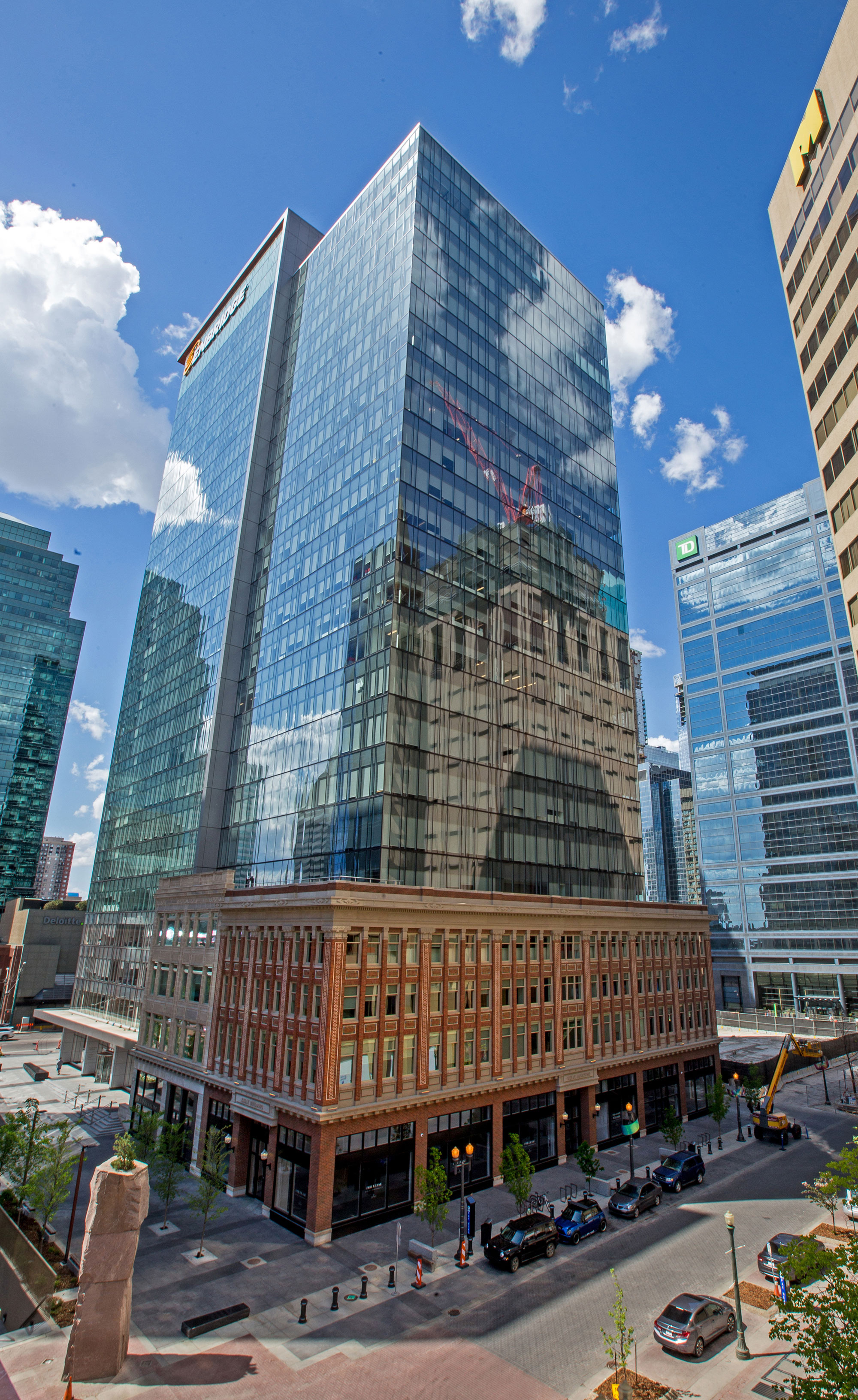 Enbridge Centre is a mixed-use project that blends historic architecture with modern design aesthetics to create a beautiful and engaging urban building. The project entails a four-storey masonry podium with commercial retail and 21-storey office tower above. Key elements include the historic masonry façade of the building which was restored and recreated, the active retail frontage on the ground floor, and the accessibility of the site. The original Ramsey and Kelly buildings suffered a major fire in 2009, leaving no choice but to rebuild completely. The design of the new Enbridge Centre incorporates the original east and south masonry façades, which were extensively documented through laser-survey and dismantled prior to construction. Damaged pieces of original stone and metal trims were recreated down to the finest detail, and were incorporated into the rebuilt façades. The new Enbridge Centre restores the historic façade to its original state, prior to the fire. The building lobby was finished in a premium grade polished marble for a modern look that compliments the historic facade.